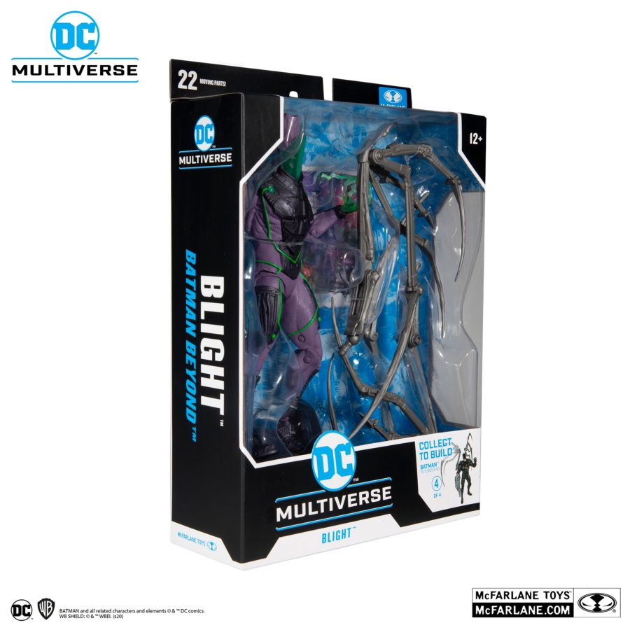 After Bruce Wayne's health began to decline, Derek Powers, the corrupt CEO of Powers Technology, merged his company with Wayne's. With access to new assets, Powers used his vast resources to develop dangerous weapons for the government. After being exposed to one of his deadly chemical agents, Powers attempted to save his own life by experimenting on himself with large amounts of radiation. But the chemical agent's effects coupled with the radiation transformed him into a monster. Now, Powers has become Blight, a radioactive metahuman with glowing translucent skin and a lethal touch! Product features: - Incredibly detailed 7" scale figures based off the DC Multiverse - Designed with Ultra Articulation with up to 22 moving parts for full range of posing and play - Blight is based on his look from the Batman Beyond Comics - Blight includes alternate hands and a base - Figure includes 1 of 4 pieces that combine with the Batman Beyond Build-a line to assemble Batman (Jokerbot) from Futures End - Included collectible art card with figure photography on the front, and character biography on the back - Collect all McFarlane Toys DC Multiverse Figures