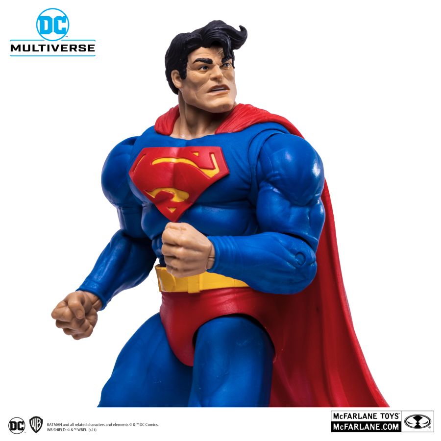 As a child, Bruce Wayne watched as his parents were brutally killed in Gotham City's Crime Alley. Traumatized by their deaths, he devoted his life to becoming the world's greatest weapon against crime - the Batman! He's a master detective and an expert martial artist, but his greatest weapon is his mind. Batman has a plan for every occasion, as well as high-tech weapons, gadgets, and vehicles to assist him in his relentless pursuit of justice! Now, after 10 years in retirement, Batman returns in an armored suit and ready for an epic battle to determine the fate of the Earth. Sent to Earth from the dying planet of Krypton as a baby, Kal-El was found by farmers Martha and Jonathan Kent and raised as their son, Clark. As Clark grew, the radiation from Earth's yellow sun gave him enhanced senses and extraordinary powers, including super-strength, super-speed, and flight. Now fully grown, he uses his powers to protect his adopted world as Superman. In the near future, after the Dark Knight comes out of retirement to fight crime once again, Superman is called in by the President to reason with Batman and quell the "ruckus" in Gotham City. Batman, however, has no plans to stop his war on crime. What results is an epic showdown between the two Super Heroes to determine the fate of the Earth. Product Features: - Incredibly detailed 7" scale figures based off the DC Multiverse - Designed with Ultra Articulation with up to 22 moving parts for full range of posing and play - Superman and Batman are featured in their look from their fight in the comic The Dark Knight Returns - Includes a specialized base - Included collectible art cards with figure photography on the front, and character biography on the back - Collect all McFarlane Toys DC Multiverse Figures