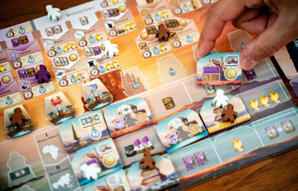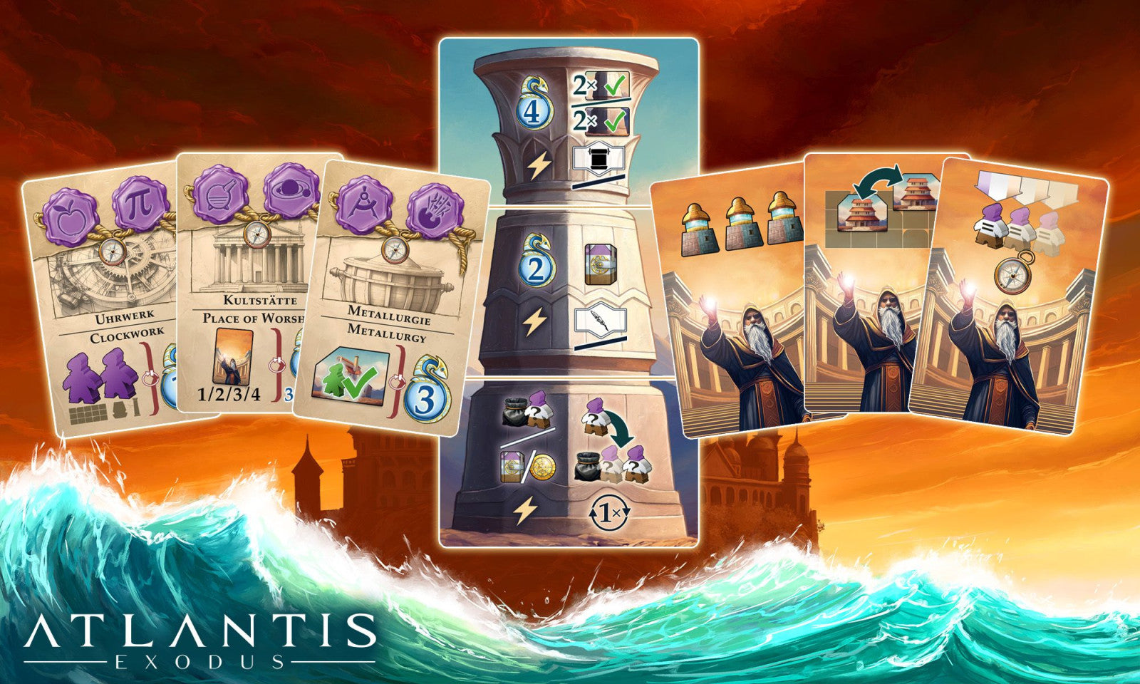 In Atlantis Exodus, with its innovative cascading rondel, 1-4 kings must face constantly-changing conditions and keep adjusting their own strategy to the different action possibilities in order to ultimately become the savior of their time.