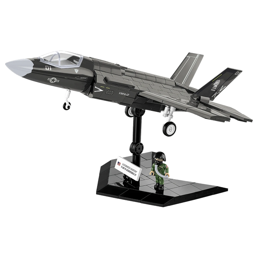 The F-35B is an American, single-seat, multi-role, fifth-generation fighter aircraft. It is a short takeoff and vertical landing (STOVL) aircraft, designed as a successor to the venerable Harrier. Build and add the first mass-produced supersonic aircraft with STOVL capabilities to your collection! F-35B - Marine Corps Variant The F-35B is the successor to the AV-8B Harrier II aircraft in the US Marine Corps. The F-35B is a Marine Corps variant, characterized by short takeoff and vertical landing (STOVL) capability, allowing for Operating from smaller aircraft carriers as well as from field airfields, it is capable of carrying out close support, bombing, and air combat missions. It was developed as part of the international Joint Strike Fighter program. Designed by a consortium of Lockheed Martin, Northrop Grumman, and BAE Systems, it has become a symbol of technological and combat superiority on the modern battlefield. Sophisticated onboard computers make it a true technological jewel. It also features an integrated helmet that provides the pilot with 360-degree visibility. The aircraft is characterized by low observability in flight, the ability to fly at supersonic speeds, and advanced reconnaissance and electronic warfare systems—including detection, tracking, targeting, and jamming. Weapons That Spread Fear The F-35B can carry weapons both in internal bays (to maintain stealth) and on external pylons (to increase firepower). The COBI model is equipped with the AGM-88G AARGM-ER anti-ship missile. Long-range radar systems designed to destroy surface targets, ground-based fixed and mobile radar stations. The F-35B is a truly multi-role aircraft – capable of air combat, bombing, reconnaissance, and electronic jamming – all within a single mission. Now you have the chance to build your own version of this fighter and add it to your collection! Why choose the F-35B LIGHTNING II set? Product under the original Lockheed Martin license – This model was created under the original license of the American manufacturer, guaranteeing a faithful reproduction of the legendary aircraft. 1:48 scale – The model has been reproduced in a scale that perfectly fits into the world of other COBI sets. This allows you to freely expand your collection with additional aircraft, and the whole thing will look cohesive and professional on a shelf, desk, or display case. 614 detailed pieces – Each block has been precisely designed to faithfully capture the character and appearance of the real F-35B aircraft. Rubber tires and movable elements - The set not only looks great but also offers full mobility. The plane features rotating rubber tires, an opening cockpit, movable controls, and an opening bomb bay. Pilot Figure - The set includes a pilot figure in a recreated American uniform with original markings, equipped with a helmet and oxygen mask with a hose. The pilot can be seated in the opening cockpit or placed next to the plane model. Authentic Prints - The model does not contain any stickers - all markings, symbols, and details are printed directly onto the bricks. This ensures the set's appearance remains durable, clear, and abrasion-resistant - even after many hours of intense play. Especially for Collectors - The set includes a specially designed base with a brick stud for attractive display, and an elegant plaque featuring the set name, scale, and the American flag. Easy to Build - Thanks to the intuitive, step-by-step instructions, building the model is a pure pleasure for both beginners and advanced builders. Designers and more experienced designers alike. Wide selection - Check out other vehicles, not just from the ARMED FORCES series, from COBI and create your own collection of incredible machines! The F-35B LIGHTNING II combines modern technology, operational flexibility, and immense firepower. Thanks to its unique vertical landing and short takeoff capabilities it can operate from locations inaccessible to other fighters such as the decks of smaller aircraft carriers or makeshift landing sites close to the front line. This is a future-proof tool, designed for the most demanding missions in the most demanding conditions. Its versatility, powerful armament, and ability to operate in heavily defended environments make it one of the pillars of modern air forces. Recreate this icon of modern military aviation in brick form – build the F-35B and experience the power of the world's most advanced fighter. Features: - 614 high-quality elements - Manufactured in the EU by a company with over 35 years of tradition - The blocks meet the safety standards of products for children - Fully compatible with other brands of construction blocks - Blocks with prints do not scratch or smear and do not fade during play or under the influence of temperature - Clear and intuitive instructions based on illustrations and step-by-step directions - 1 figure - Scale 1:48 Model dimensions (L x W x H): 325 mm x 215 mm x 95 mm