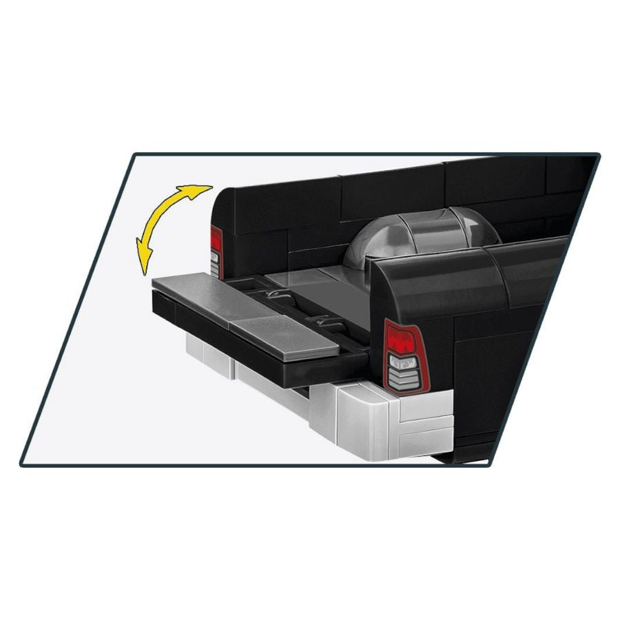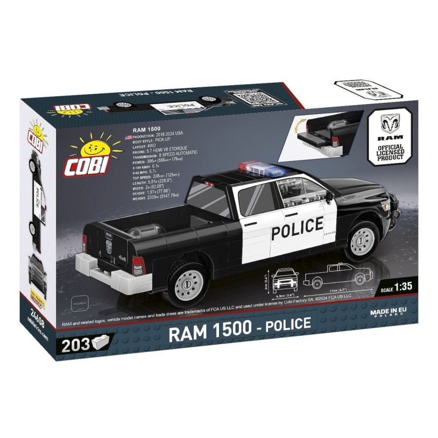Nothing makes your heart beat faster on an American road than the sight of police lights in the mirror and the sound of a siren! Designed with attention to detail, the RAM 1500 police car model in 1:35 scale is a real treat for motoring and building enthusiasts. This unique police version of the pickup truck consists of 203 precise elements, including realistic bodies, rims and characteristic police details that perfectly reflect the appearance of the vehicle in the service of the law. High-quality prints make the model look like a miniature version of the legendary American truck. Thanks to rubber tires and rotating wheels the fun becomes more realistic, and solid block axles guarantee durability. The RAM 1500 police model is not only great fun, but also an excellent collector's item. Complement your growing collection of COBI cars in the 1:35 scale with a powerful police pickup truck that will surely become the star of your block garage. Build your own legend and feel like a law enforcement officer on duty! The RAM 1500 is a full-size pickup truck manufactured by the American brand RAM, which belongs to the Stellantis group. The car is distinguished by its powerful engines, spacious cabin and advanced technologies, which makes it a popular choice for drivers looking for a durable vehicle for work as well as a comfortable vehicle for everyday use. A characteristic feature of the RAM 1500 is its load and towing capacity, which are equal to the best models in its class. Features; - 203 high-quality elements - Manufactured in the EU by a company with over 35 years of tradition - The blocks meet the safety standards of products for children - Fully compatible with other brands of construction blocks - Blocks with prints do not scratch or smear and do not fade during play or under the influence of temperature - Clear and intuitive instructions based on illustrations and step-by-step directions - Scale 1:35 Model dimensions (length x width x height): 17 cm (6.7") x 6.5 cm (2.6") x 6 cm (2.4")