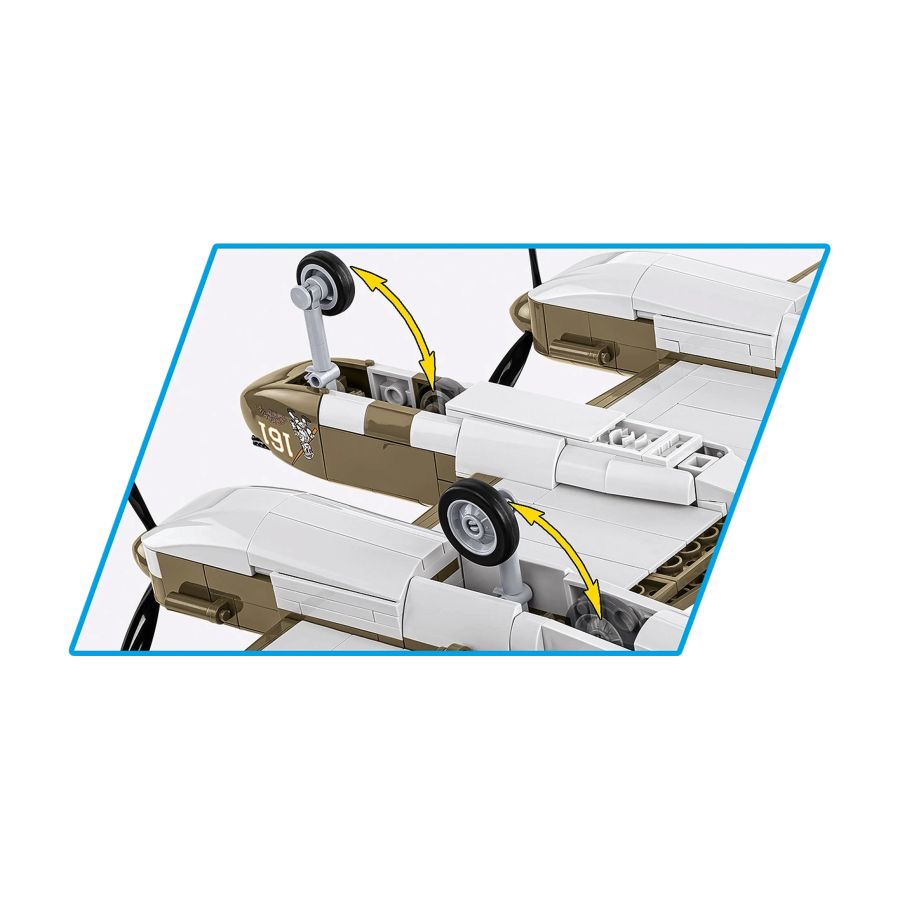 The Lockheed P-38H Lightning set returns to the offer from COBI in a scale of 1:32, in a new color and with more elements - a real treat for lovers of aviation history and block modeling! The P-38H model in a new version from COBI is more than just a model - it is an invitation to a journey through time that takes us to the 1930s, when Clarence "Kelly" Johnson designed this unique fighter. The P-38H was one of the key American aircraft during World War II, famous for its unusual design, including its double fuselage. Powered by twin Allison V-1710-111 engines with 1,425 hp each, it had an impressive power of 2,850 hp. As one of the fastest fighters of World War II (671 km/h), the P-38H was also distinguished by its great maneuverability, speed and versatility, which made it irreplaceable on many fronts - both in Europe and the Pacific. Equipped with 4 x 20mm cannons and 2 x .50 machine guns, as well as the ability to carry additional weapons, it was a powerful weapon in the hands of Allied pilots. The new set, enriched with additional elements and a new color, allows for an even better representation of the characteristic silhouette of this legendary machine. What makes the P-38H Lightning set stand out: 650 elements - This number of blocks allows you to reproduce the small details of the plane, and the construction itself gives great satisfaction, offering an advanced construction process that will satisfy every modeling enthusiast. Movable elements - The P-38H has moving parts, such as rotating propellers, folding landing gear, movable ailerons and an opening cockpit, in which you can place a well-designed pilot figure. High quality of workmanship - COBI blocks guarantee excellent quality, precise fit and durability, which makes the model not only aesthetic, but also very durable. Easy construction - Intuitive step-by-step instructions make assembling the model a pleasure. The set is suitable for both beginners and experienced builders. Pilot figure - A pilot figure with historical markings has been added to the set, which wonderfully complements the plane model. Educational fun - By assembling the Lockheed P-38H model, you can learn about the fascinating history of this aircraft, which played a key role in World War II. It is a great opportunity to learn about war technology and the history of aviation. Collector's item - The plane can be placed on a display stand with a commemorative plaque, which perfectly complements the model and makes it look great on every collector's shelf. Part of a larger ction - If you are a fan of aviation history, check out other sets from the HISTORICAL COLLECTION series from COBI and create your own collection of legendary military machines! With the new Lockheed P-38H model from COBI, you can not only discover the fascinating history of aviation, but also add this legendary machine to your collection! Start your adventure now and feel like a pilot in a fight in the skies! Product Features: - 650 high-quality elements - Manufactured in the EU by a company with over 35 years of tradition - The blocks meet the safety standards of products for children - Fully compatible with other brands of construction blocks - Blocks with prints do not scratch or smear and do not fade during play or under the influence of temperature - Clear and intuitive instructions based on illustrations and step-by-step directions - 1 figure Model dimensions: 35.5 x 49 x 8.5 cm Box dimensions: 40 x 6 x 30.5 cm