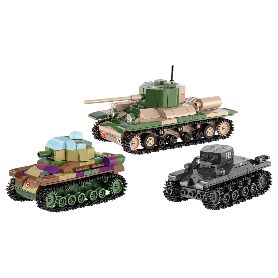 A representation of three historic tanks from the Second World War, which were selected from the distinguished exhibition of the largest armor museums in Europe! With one set of COBI blocks you can build: - British Valentine IX tank from The Tank Museum - German Panzer I light tank from the Deutsches Panzermuseum Munster - French Renault R35 main battle tank from the Musée des Blindés The tank models have been carefully designed from the highest quality COBI construction blocks in a uniform 1:48 scale and match each other in size. The block vehicles have movable wheels and tracks, as well as turrets that can be rotated 360 degrees. The blocks have prints with characteristic markings and vehicle details. Models of historical tanks are easy to build. The entire construction process is guided by a simple and intuitive construction manual, with a list of elements at the end. When built, the British Valentine light tank measures 14 cm (5.5") long. The German light tank designed in the interwar period, Panzer I, is 8.5 cm long (3.3") when built. The French R35 main battle tank designed in the 1930s configuration is 9 cm (3.5") long when built. The block tanks set is the perfect starter pack that can begin an extraordinary collection of historical vehicles from COBI! The set is a great souvenir to give yourself and a memory of an unforgettable visit to a huge tank museum. The vehicles are perfect for a collector's shelf or desk and as a toy for younger fans of military technology. If you are an advanced block designer the models will provide you with very interesting elements with which you can build anything you can imagine. Express your passion through blocks, and build history, piece by piece, with COBI! Features; - 595 high-quality elements - Produced in the EU by a company with over 20 years of tradition - The blocks meet the safety standards of products for children - Fully compatible with other brands of construction blocks - Blocks with prints do not scratch or smear and do not fade during play or under the influence of temperature - Clear and intuitive instructions based on illustrations and step-by-step directions - Model of the British Valentine IX tank from The Tank Museum - Model of the German Panzer I tank from the Deutsches Panzermuseum Munster - Model of the French Renault R35 tank from the Musée des Blindés Valentine IX tank dimensions (L x H): 14.5 cm (5.7") x 7 cm (2.7") Panzer I tank dimensions (L x H): 8.5 cm (3.3") x 4.5 cm (1.8") Renault R35 tank dimensions (L x H): 9 cm (3.5") x 5.5 cm (2.2")