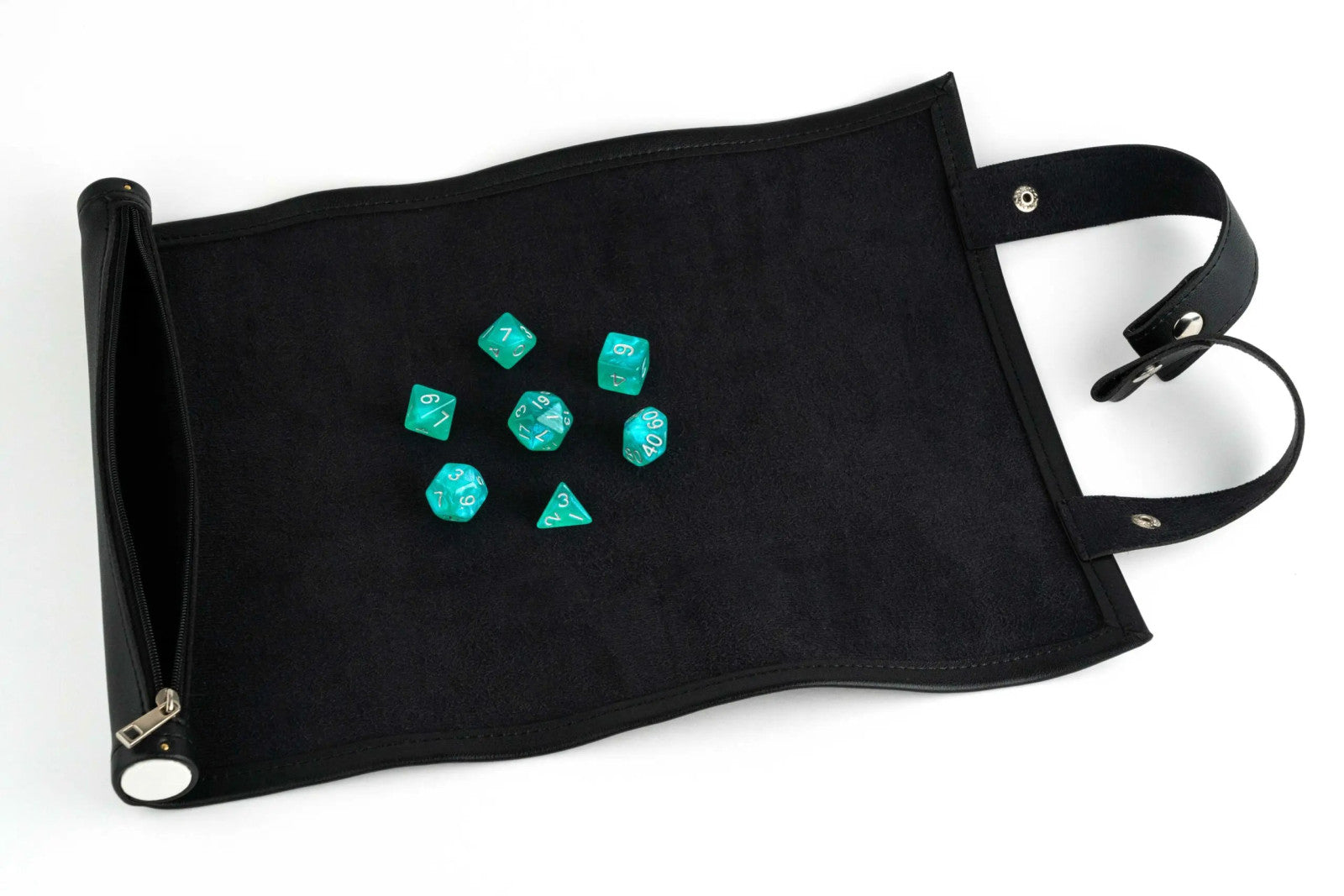 Our scroll rolling map appears to be a rolled up leather scroll, but unwinds into a soft rolling mat for your dice. The secret zipper compartment holds all your favorite dice.