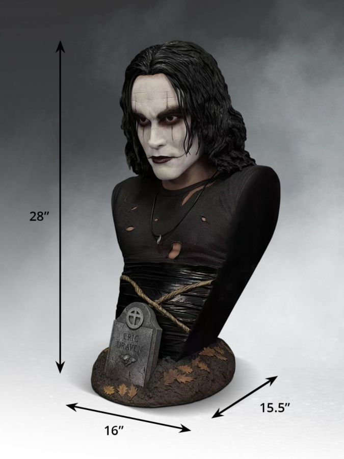 Standing 28" tall, this lifesize bust is a commanding tribute to Brandon Lee's unforgettable portrayal of Eric Draven in The Crow, capturing the character in a moment of cold resolve. Every contour of his face has been carefully sculpted to reflect the stark, poetic intensity and restrained fury that defined his performance. The iconic face paint is layered with subtle texture, preserving the raw, hand applied look that made the character feel human. Premium acrylic eyes bring the portrait to life with striking realism. They catch and hold just enough reflection that, as you move around the piece, the gaze seems to follow, creating an unsettling sense of presence that painted eyes simply cannot replicate. Each piece is individually hand-finished and hand-painted to achieve nuanced skin tones, while realistic rope texture and contrasting surface finishes add depth and definition to his iconic costume. The themed base anchors the piece in Eric Draven's mythology. A weathered grave marker bearing his name rises from textured earth scattered with fallen leaves, grounding the bust in atmosphere without overpowering the portrait itself. A striking homage to a performance that transformed a character into a legend!