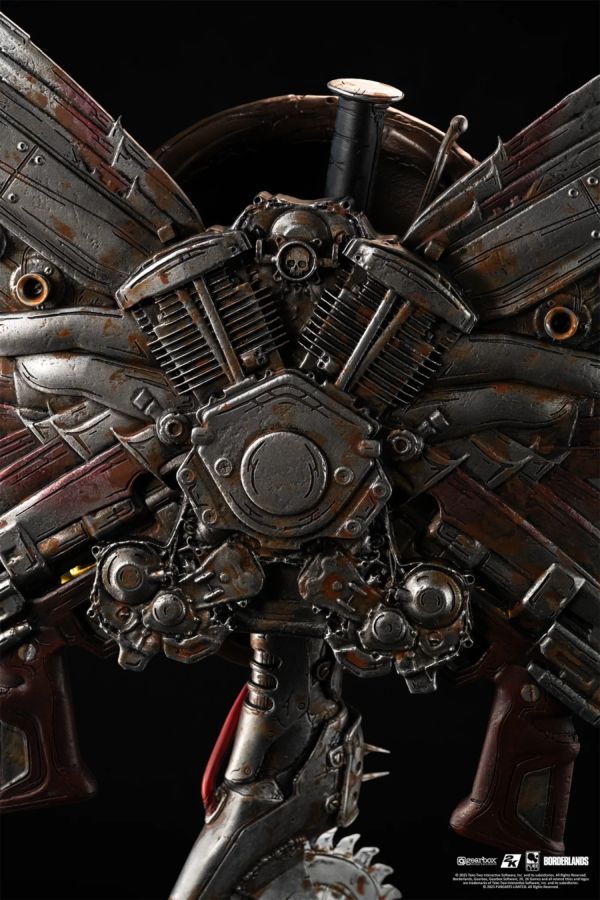 "Look me in the eyes when I stare at you." Bring the world of Pandora home with the Borderlands Psycho Bandit Art Mask Exclusive Edition! With glowing LED-lit eyes, a free-spinning rusted Buzz Axe base, and a chaotic explosion of guns, ammo, and motor engines, this 1:1 scale art mask is a shrine to mayhem. PRODUCT HIGHLIGHTS - Hyperdetailed art mask of the Psycho Bandit from Borderlands - LED-lit eyes - Highly detailed free-spinning rusted Buzz Axe base - Limited edition, individually numbered