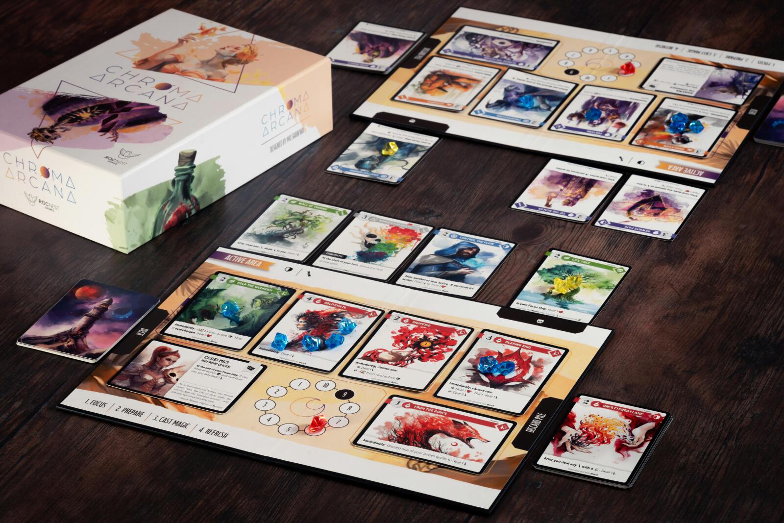 Chroma Arcana is a tactical card game set in a fantasy world. Players take on the roles of powerful mages, using their knowledge of the arcane arts to outmanoeuvre and defeat their opponents. Each mage has access to a unique combination of Spells based on their chosen colours of magic, allowing for a diverse range of gameplay options and strategies. The goal of the game is to reduce your rival's health to zero. On your turn, you can place spell cards into your spellbook. Then, you can discard cards of a matching colour to charge those spells up. Once a spell is charged up, it must be cast!