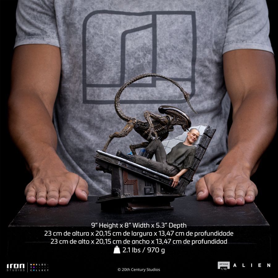 Produced in Polystone by Iron Studios in the Art Scale line, the Ellen Ripley and Dog Alien statue depicts an intense confrontation between the heroine and the creature. The composition highlights Ripley in a defensive stance, ready to face the threat, while the Dog Alien emerges in an aggressive posture, creating a scene filled with tension and dramatic impact. The paint application enhances the details of the costume, facial expressions, and the organic textures of the Xenomorph, while the themed base complements the dark atmosphere characteristic of the franchise. A striking piece for Alien saga fans and film collectors.