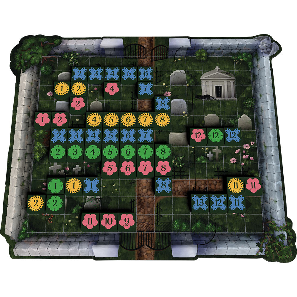 In Immortal, players will take turns adding Flower tiles to their available flowers or placing them in rows or columns on the Cemetery board. Lines of Flowers must be either sequential numbers or the same number, but different colors. The player who places all their Flowers first is the winner!